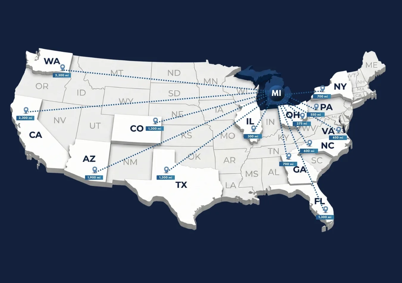 Transport times vary by distance. For example, shipping from Michigan to nearby states may take 1–3 days, while cross-country shipments, like those to California, can take 7–9 days. We provide estimated delivery windows with every booking.
