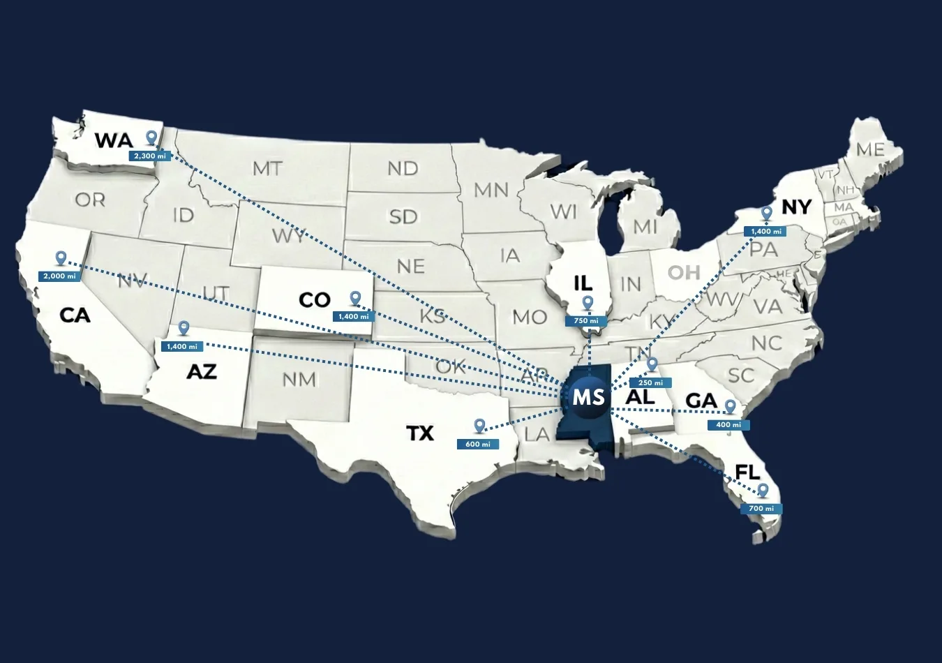 Shipping times from Mississippi typically range from 2 to 7 days, depending on the destination. Cross-country trips, such as to states like California may take up to 8 days or more.